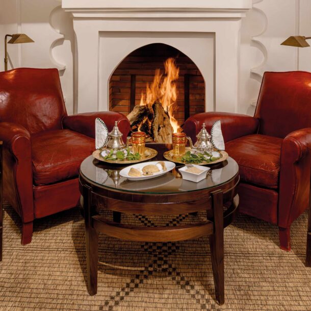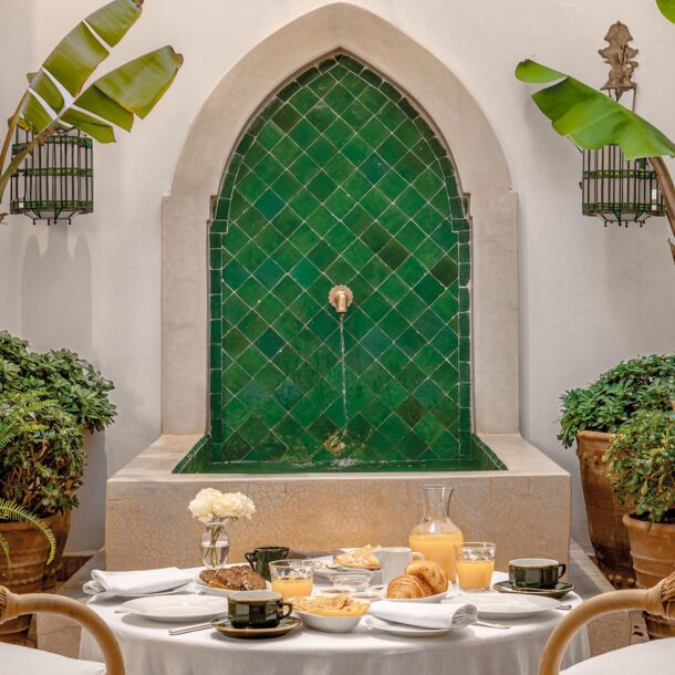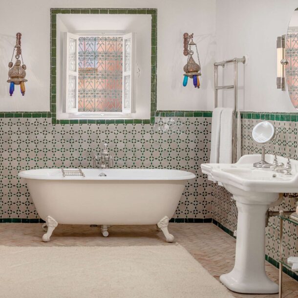 La suite Agadir, la suite más grande del riad, se abre, a través de puertas acristaladas del piso al techo, a un patio privado con una fuente de azulejos verdes de Fez. El escenario perfecto para disfrutar de desayunos, almuerzos y cenas a la luz de las velas. Con sus techos altos y su disposición de planta abierta, la suite es amplia y luminosa con la comodidad adicional de una chimenea. Una cama emperador vestida con fino algodón egipcio y cachemira se asienta sobre una alfombra mauritana de junco y cuero y está flanqueada por cuencos de prueba de principios del siglo XIX para el sur de Marruecos. Un vestidor está junto al dormitorio, que a su vez conduce a un espacioso cuarto de baño alicatado con ducha y bañera.